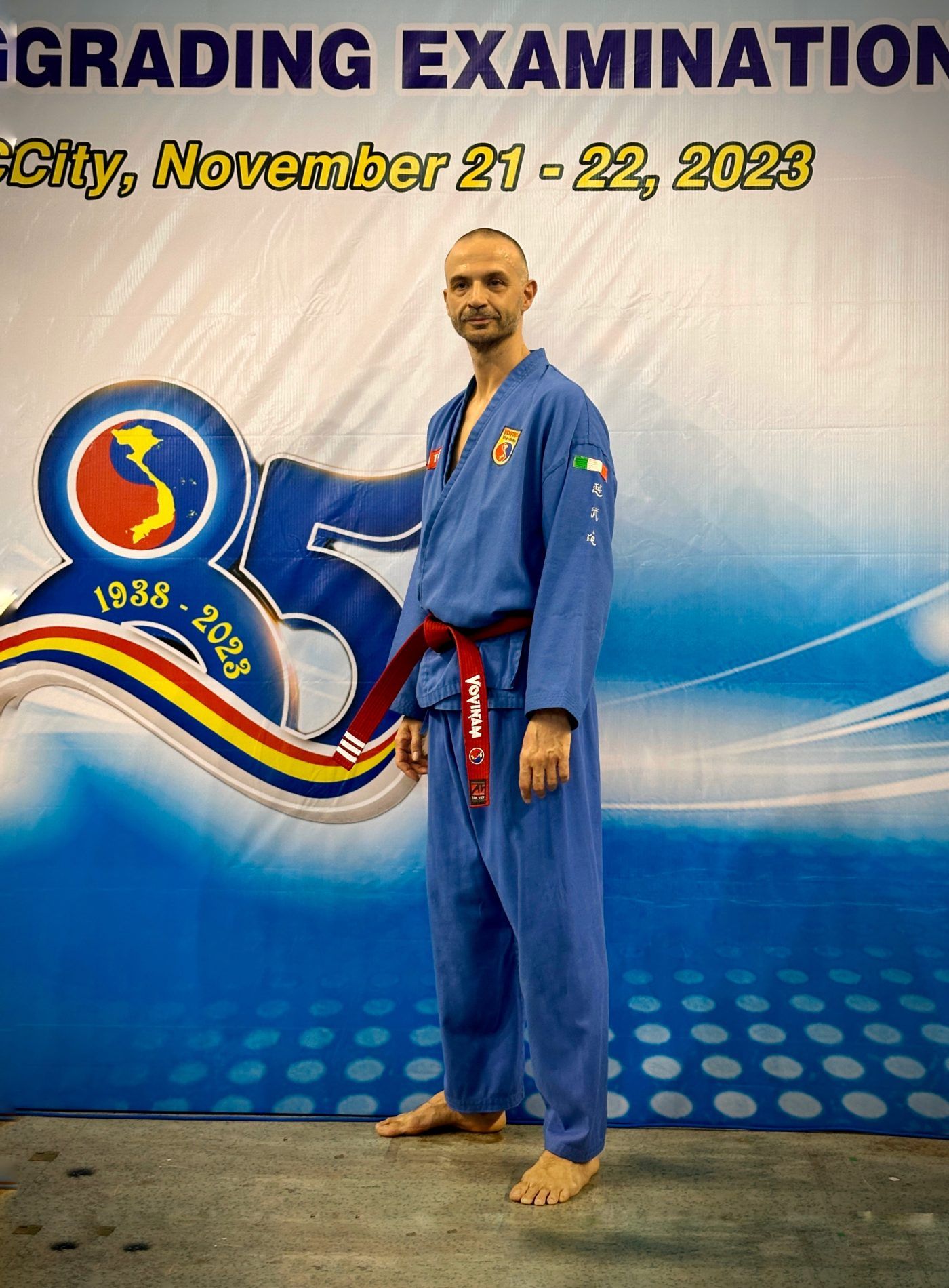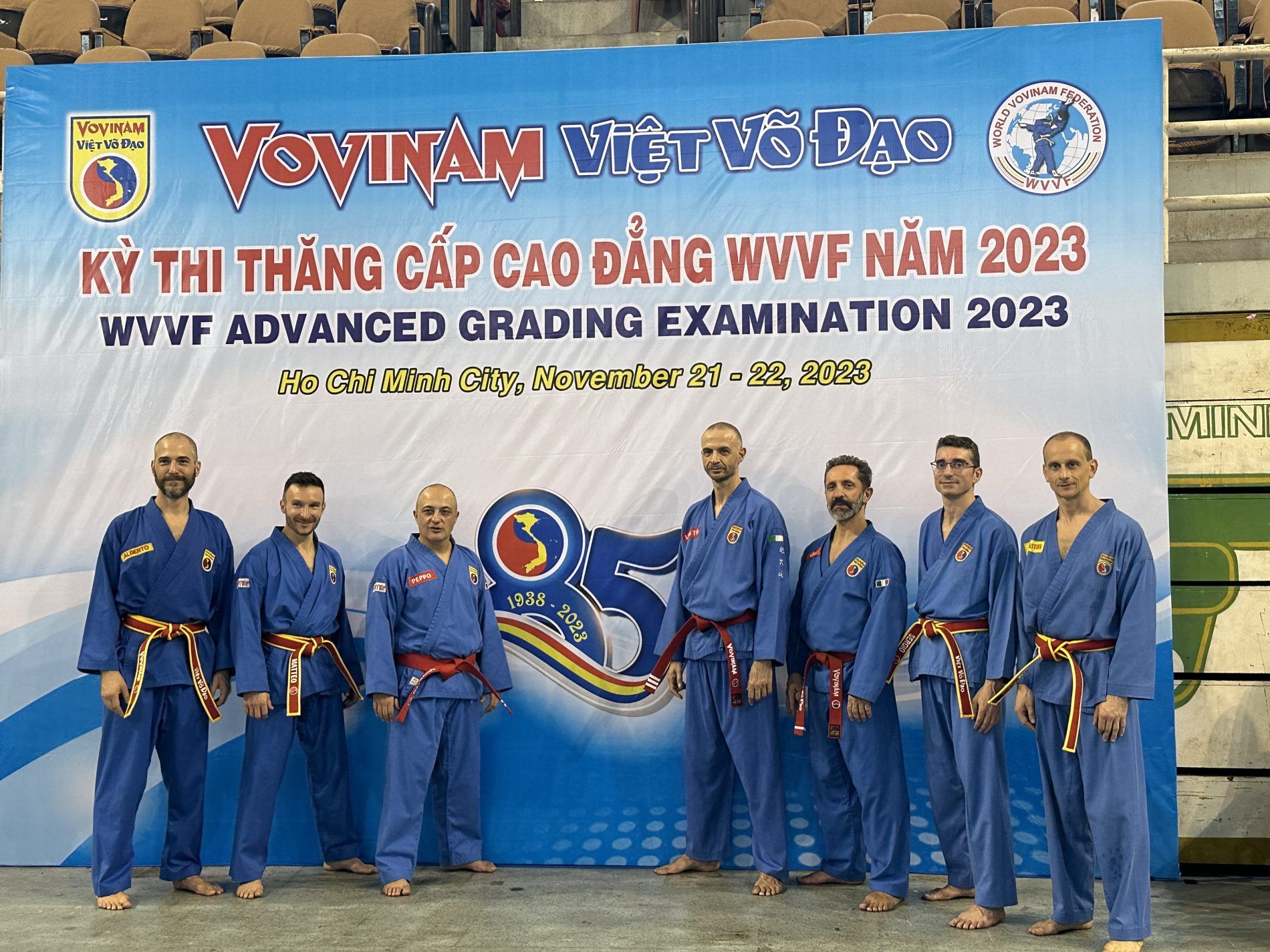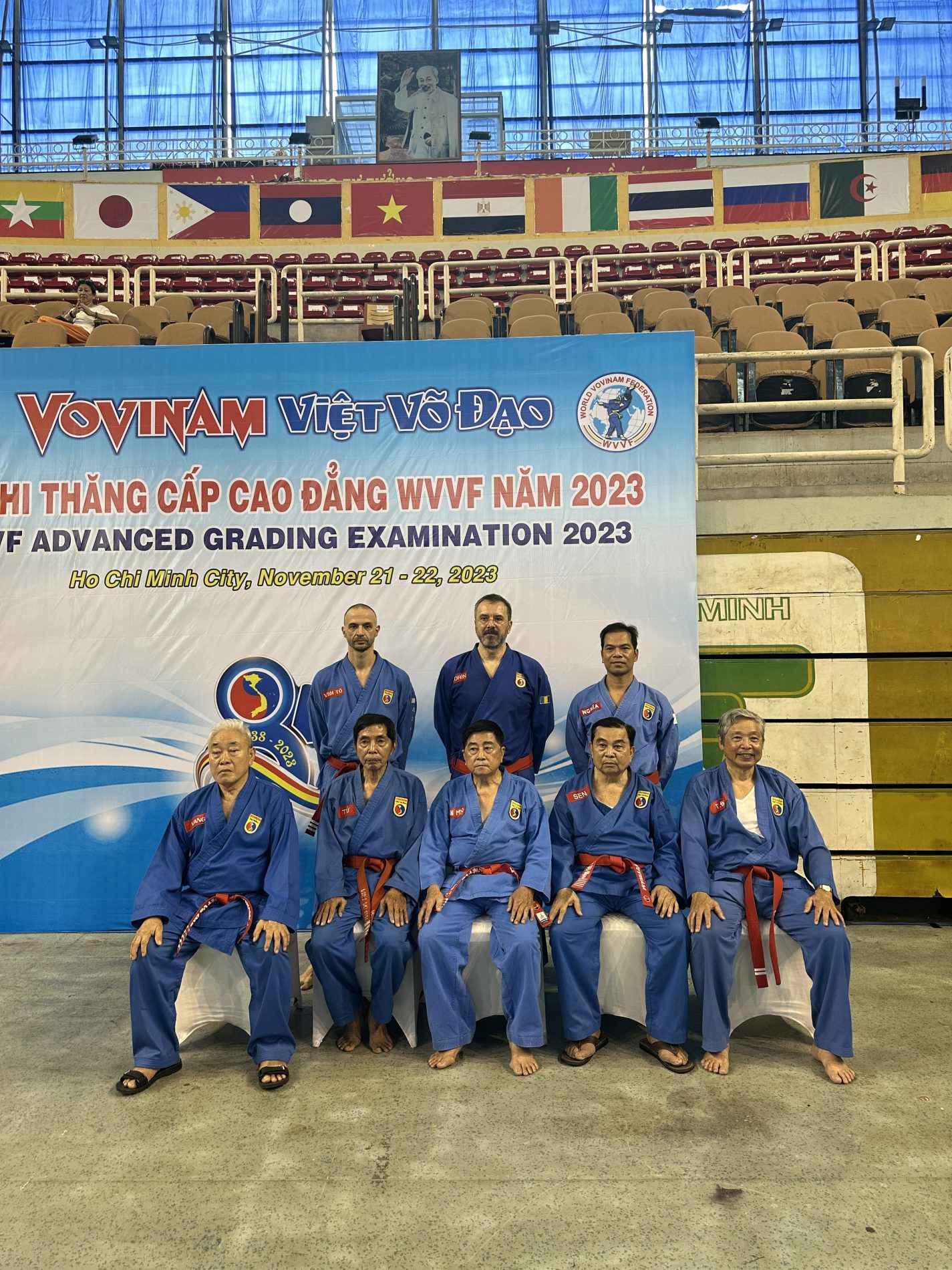 Il motivo è nato dal fatto che per la prima volta, dopo la sessione di maggio 2023, è stata organizzata una sessione per il grado di Cintura Rossa 3° cap (Hong Dai Tam Cap), ossia il 7° dang. Vista l’importanza, oltre che essere la prima per dei candidati non vietnamiti, il Consiglio dei Maestri ha deciso di organizzarla un giorno prima. La sessione si è tenuta presso il TO DUONG in una forma “quasi” privata. Mentre gli esami dal 4° dang al 6° dang nella sessione del 22 Novembre presso il Phu Tho Stadium.